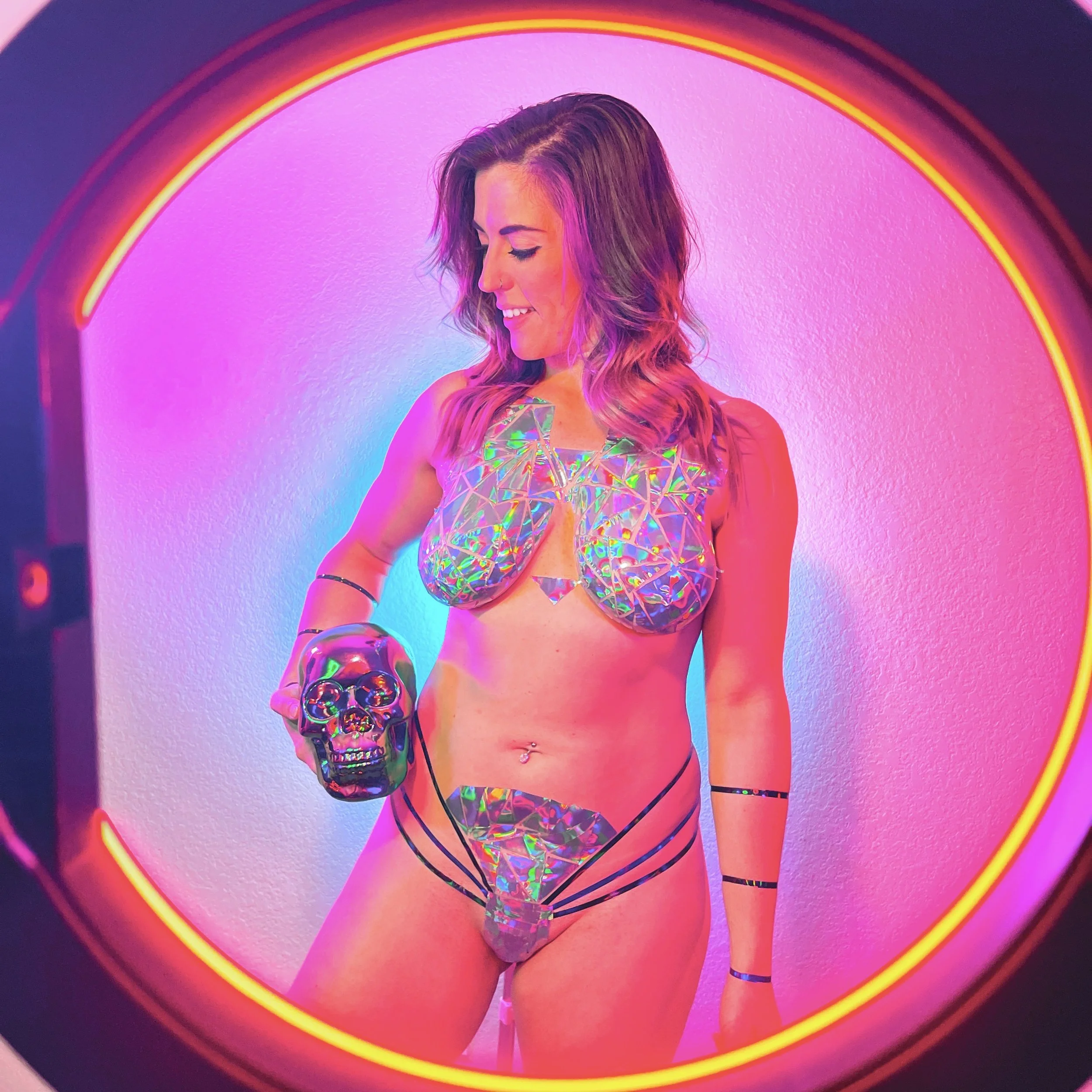 The intent of this art project is to showcase Klutch’s remarkable and creative taping designs, allowing him to make them unique to each model and canvas while I applied the rose colored signature colored lights to the party. I wanted to experiment with a brighter set of holographic colors, especially after Klutch expressed the tape color choice can drastically alter the end product based on how well it reflects the lighting around it. This inspired our approach to trying out brighter, iridescent color choices and having the Rose Colored lighting design supercharge the holographic tape in astonishing and beautifully unpredictable ways. Even with production setbacks, with rest and recovery, we rose from the ashes like a phoenix. It took almost a year of collaborative tenacity and professional perseverance to keep the artistic vision intact. We have 3 powerful queens dressed in a kaleidoscope of colors with remarkable tape designs that transform in stunning ways under the polychromatic lights.
